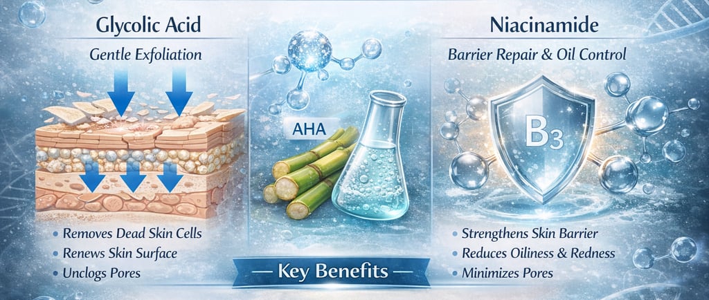 When combined, glycolic acid and niacinamide offer a biologically complementary approach to skin cleansing. Glycolic acid gently exfoliates and clears surface buildup, promoting smoother skin and improved clarity. Niacinamide counterbalances this action by reinforcing the skin barrier, reducing inflammation, and maintaining hydration.